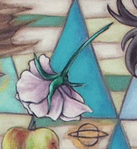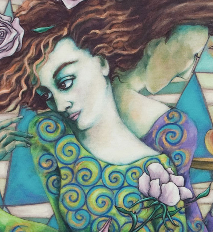 De versteende draak draagt de illusies uit de gedachtewereld met zich mee en waakt ervoor dat ze getoond worden. De parel waarmee hij zijn magische krachten gebruikt is verhuld in zijn tong. In strijd is zijn overwinningsdrang groot. De twee vrouwen balanceren rug aan rug als een weegschaal, zoekend naar evenwicht en Waarheid. Ze zijn aan elkaar verbonden; ieder met z’n eigen verlangens.